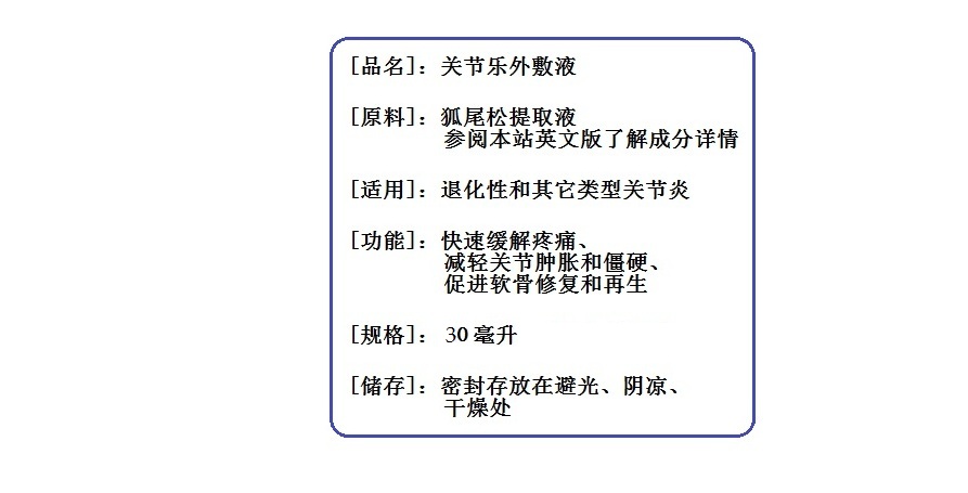 • 与其他治疗关节炎的产品不同,“关节乐”可以从根本上改善关节健康,让您拥有更健康、舒适和活力的生活。